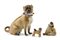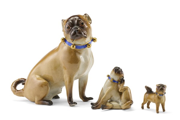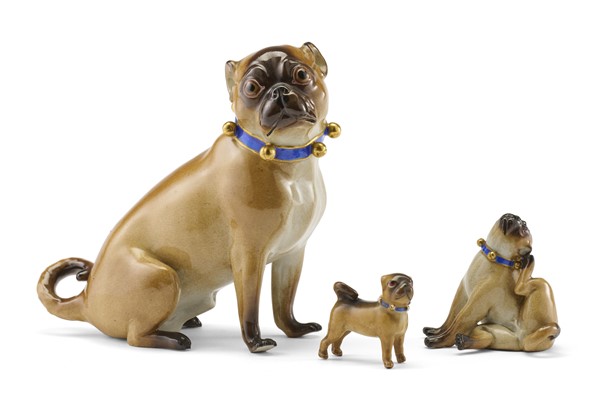 Manifattura di Meissen, secolo XIX. Da Johann Joachim Kaendler. "Carlino con campanelle", due figure diverse in porcellana dipinta in policromia unite ad una figura di carlino di simil decoro di altra manifattura (h. max cm 13) (difetti, mancanze e restauri)