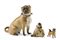 Meissen manufacture, 19th century. After Johann Joachim Kaendler. "Pug with bells", two different polychrome painted porcelain figures with a pug figure of similar decoration of other manufacture (h. max cm 13) (defects, losses e restoration)