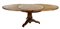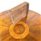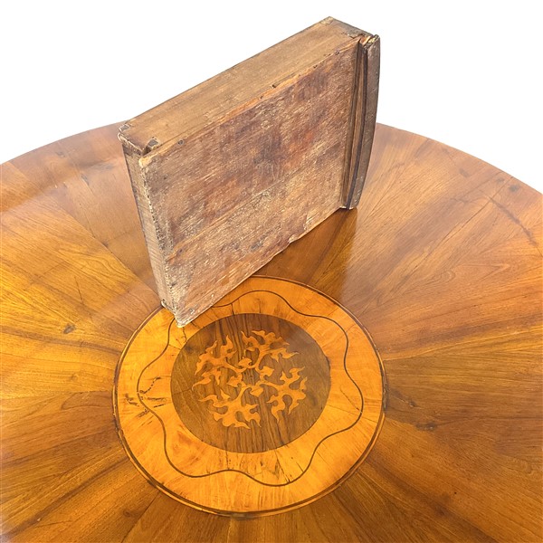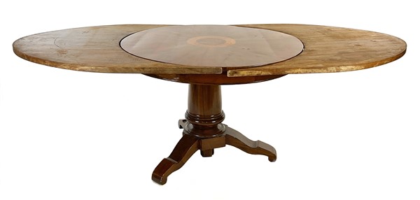 Tavolo con piano circolare lastronato e massello di noce, piano centrato da decoro ad intarsio, sostegno a colonna su tripode (d. cm 110, h. cm 75) dotato di due allunghi a mezzaluna di epoca successiva (l. cm 62) (difetti e restauri)