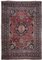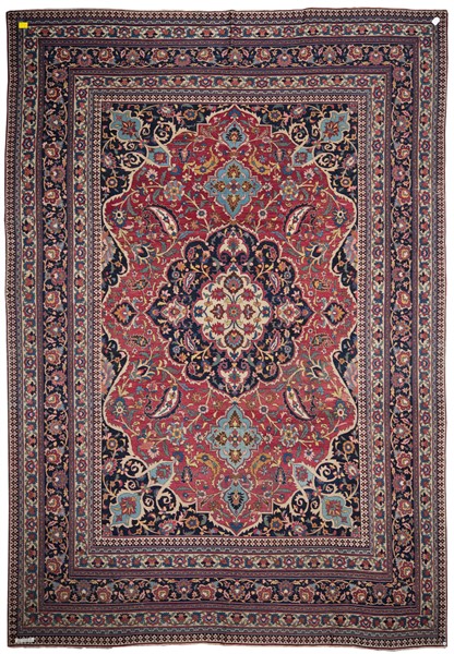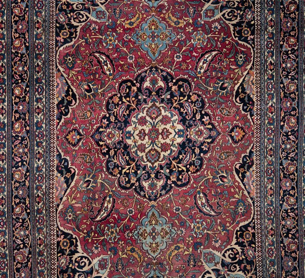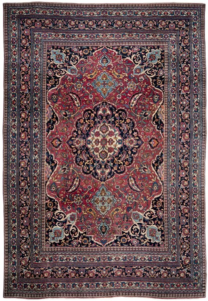 Tappeto Kohrassan, Persia, inizio secolo XX. Decoro con medaglione polilobato a fondo bianco e blu, con puntali azzurri, campo bordeaux decorato da piumaggi e rami fioriti di memoria safavide. Angolari a fondo blu notte con fiori, molteplici bordure tra cui la principale a fondo blu notte con motivo Herati. Cornice Medacyl bianca e blu notte che risolve il campo e termina la decorazione del tappeto (cm 442x317) (lievi difetti)
