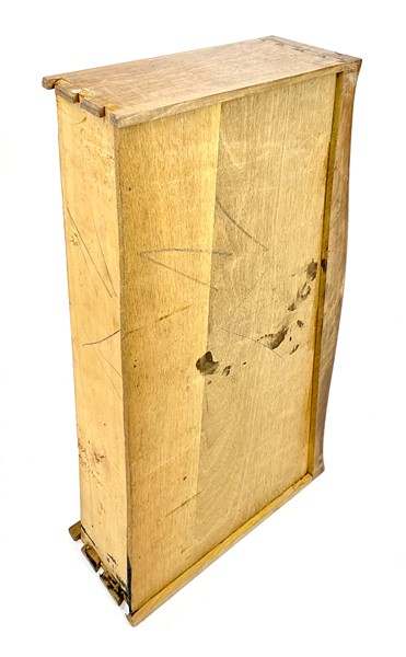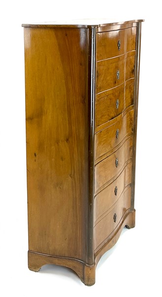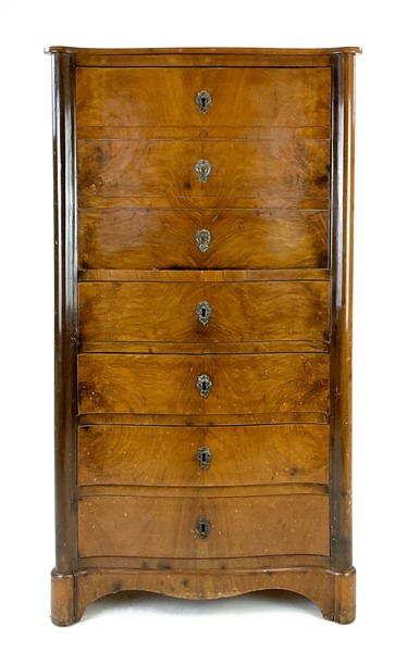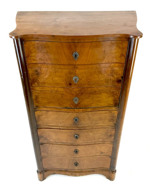 Piccolo secretaire impiallacciato in noce e radica di noce, fronte a quattro ca