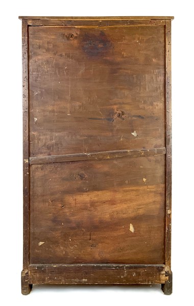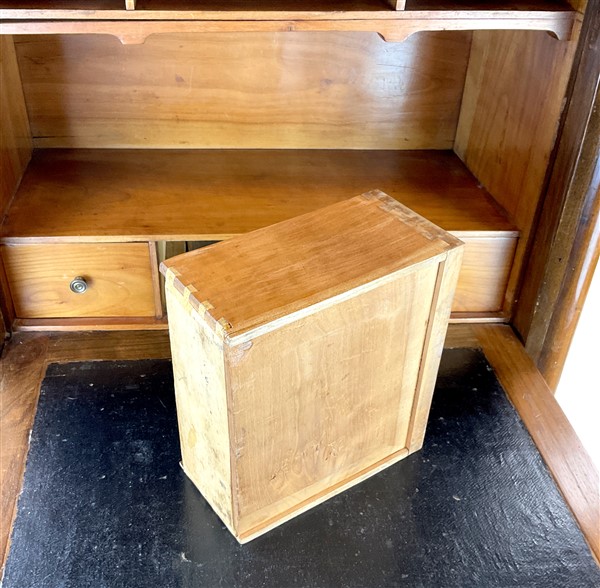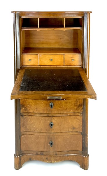 Piccolo secretaire impiallacciato in noce e radica di noce, fronte a quattro cassetti e calatoia celante tre tiretti e vani a giorno (cm 63x111x32) (difetti)