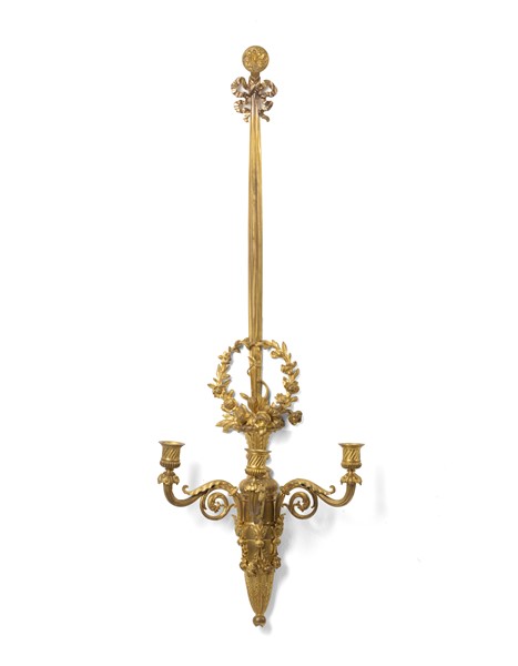 Lotto 95 | Applique in bronzo dorato a tre fiamme con decoro a finto tendaggio terminante