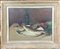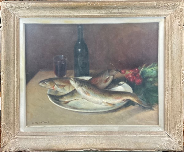 Umberto Montini "Composizione con pesci, vino e ravanelli" olio su tela (cm 50x