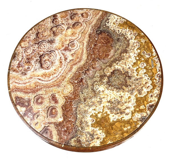 Tavolino da salotto tondo con fusto e base in marmi differenti, piano in alabastro fiorito con bordura in legno impiallacciato. (d cm 59, h cm 53) (difetti e mancanze)