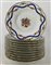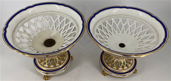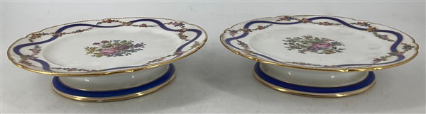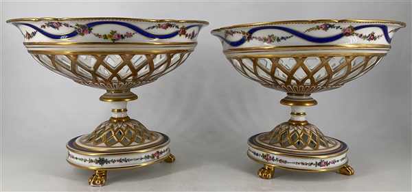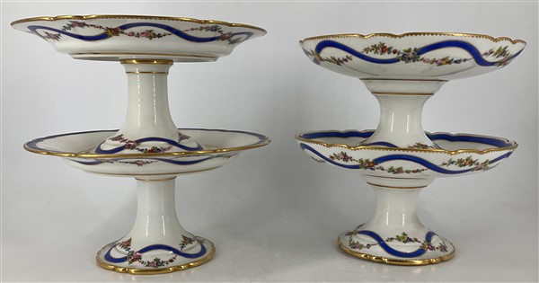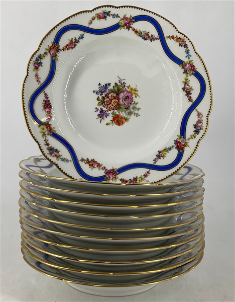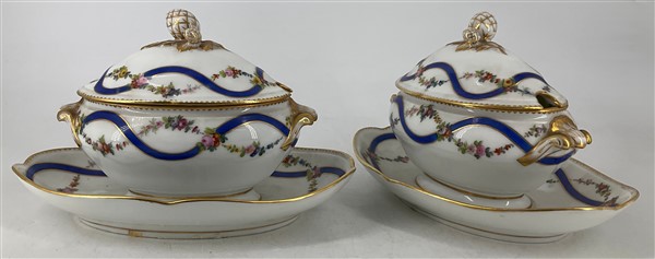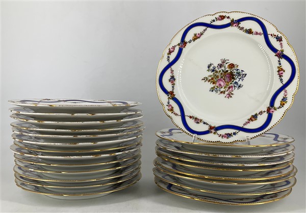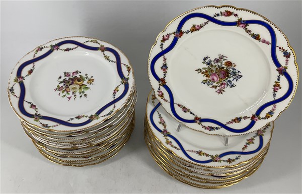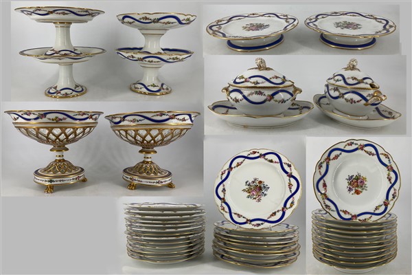 Manifattura francese, inizio secolo XX. Parte di servizio da tavola in porcellana decorata in policromia nello stile Sèvres a nastri blu e fiori con profili in oro, composto da nove piatti piani, undici piatti fondi, tredici piatti da frutta, due salsiere con coperchio, quattro alzate e due alzate traforate. (difetti e restauri)