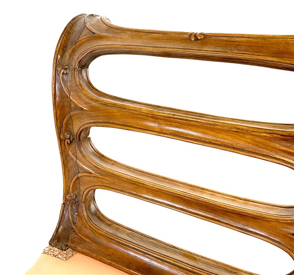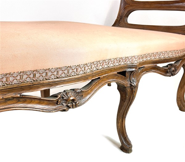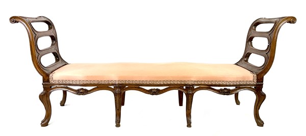 Panchetta da muro in legno intagliato e traforato con gambe mosse e braccioli curvi terminanti a ricciolo. Secolo XIX (cm 230x91x64) (difetti e mancanze)