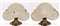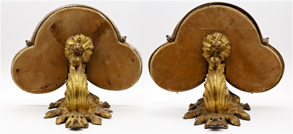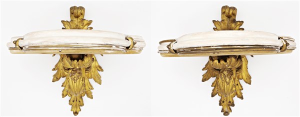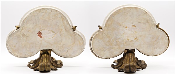 Coppia di mensole con sostegno a voluta e foglie in bronzo dorato, piano polilobato in legno dipinto (cm 44x43x35) (difetti)