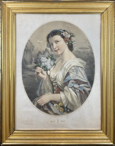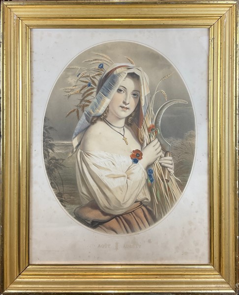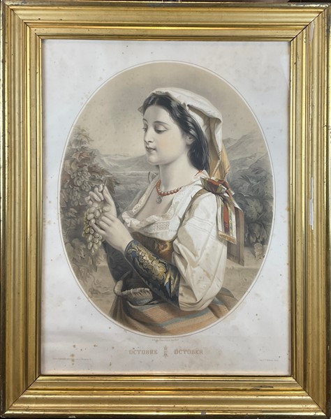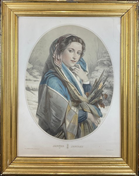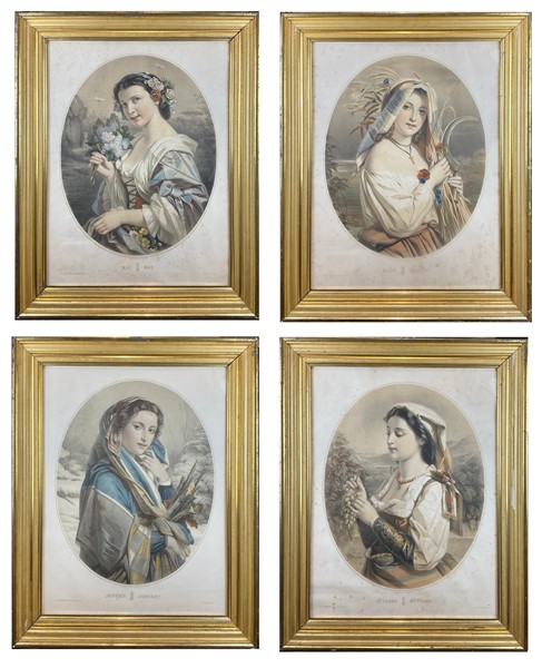 Quattro litografie francesi del secolo XIX da invenzioni di Brochart raffiguranti "Gennaio", "Maggio", "Agosto" e "Ottobre"