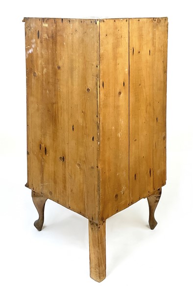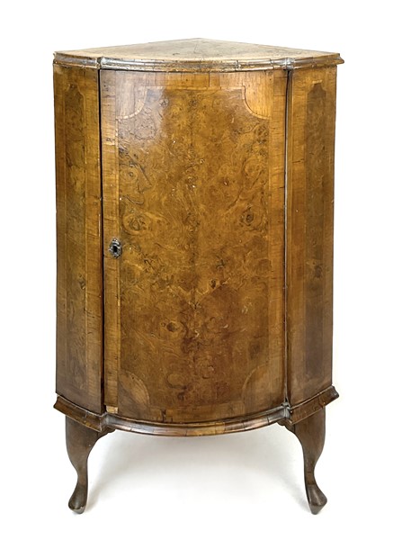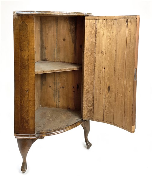 Cantonale ad uno sportello lastronato in noce e radica di noce e filettato, piedi mossi (cm 91x40) (difetti e mancanze)