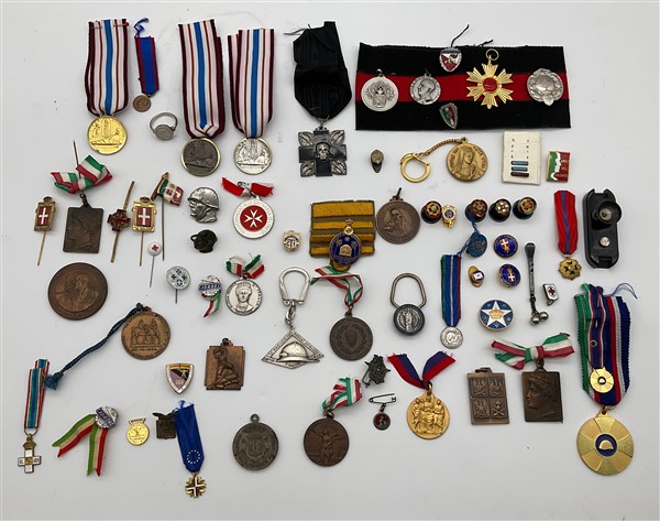 Lotto composto da numerose spille, monete, cimici e medaglie di argomento, materiali ed epoche diverse tra cui: due distintivi-spille del Ventennio Fascista col profilo di Mussolini con elmetto; gruppo di spille della Guardia d'Onore scelta alle Reali Tombe del Pantheon; croce commemorativa per il centenario degli Arditi d'Italia; Medaglia della Fraternità Alleata della Federazione Franco-Italiana degli Ex Combattenti Alleati con nastro; Medaglia per il 400° anniversario della Fondazione dell'Ordine dei Santi Maurizio e Lazzaro del 1973 (difetti da esaminare)