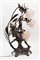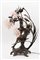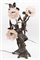 Lampada d'appoggio in antimonio a tre luci con sostegno a figura femminile con bimba e bracci a rami fioriti con paralumi in vetro rosa. Inizio secolo XX (h cm 56) (difetti)