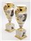 Manifattura francese, secolo XIX. Coppia di vasi biansati in porcellana su basi a plinto, corpo decorato da pappagalli in policromia, profili e decori floreali dorati (h. cm 35) (difetti, restauri e rotture)