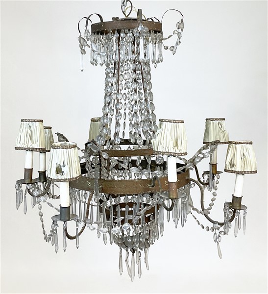 Lampadario a cesto con otto luci in metallo e lamierino inciso, bracci a voluta raccordati da festoni e pendenti in vetro. (h cm 85) (difetti e lievi mancanze)