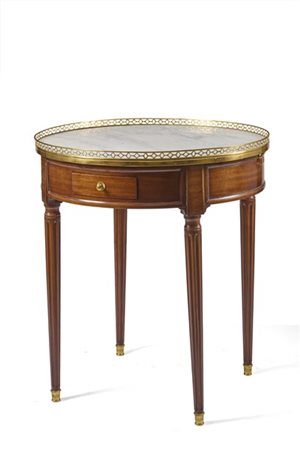 Tavolino da salotto di forma circolare a due cassetti e due tiretti nella fascia, piano in marmo incassato decorato da ringhiera traforata, gambe tornite e scanalate. Francia, inizio secolo XX (h. cm 70, d. cm 64) (difetti)