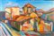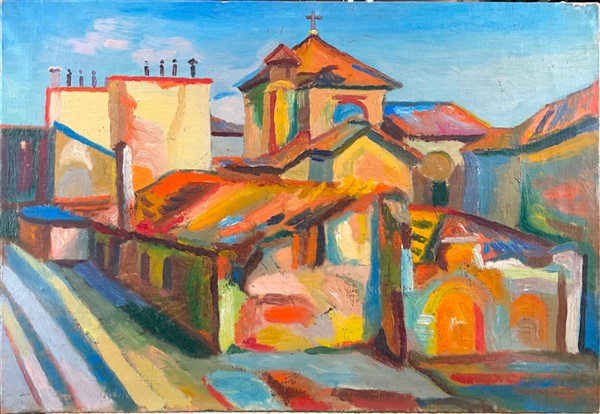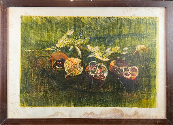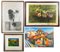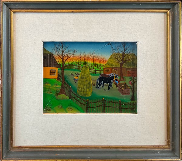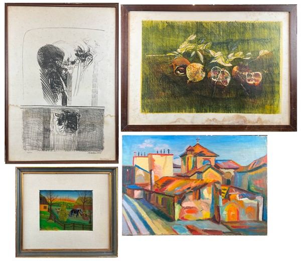 Lotto composto da due litografie di Cazzaniga e Addamiano di soggetti diversi (circa cm 50x70), un olio su tela raffigurante paesaggio non firmato (cm cm 38x55) e un dipinto su vetro naif firmato Josha (cm 18x23,5)