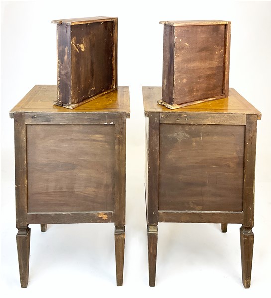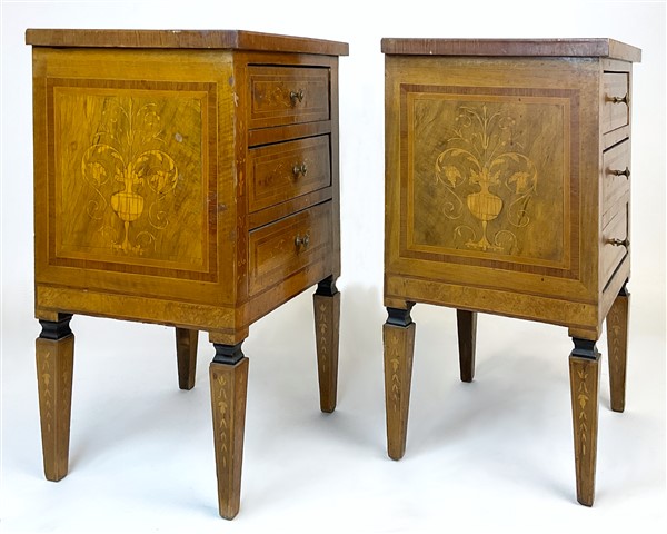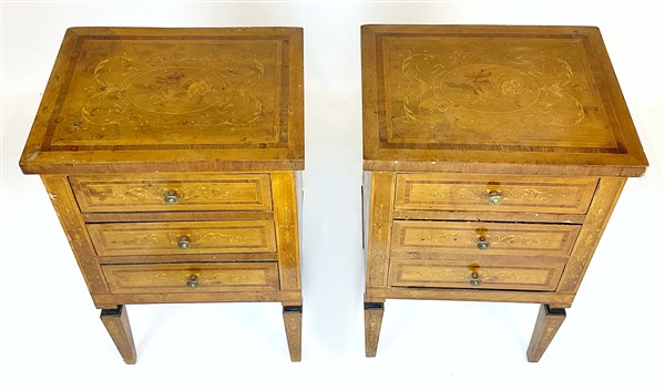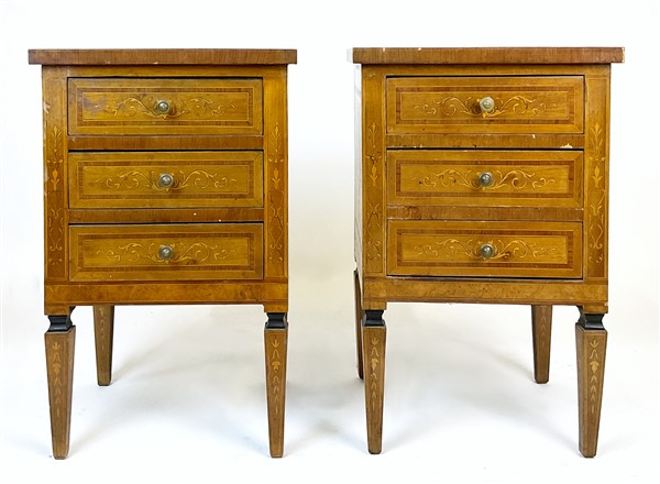 Coppia di comodini lastronati, filettati e intarsiati in legni di varie essenze con tre cassetti e decoro a volute, piedi a obelisco rovesciato (cm 70x45x36) (difetti)