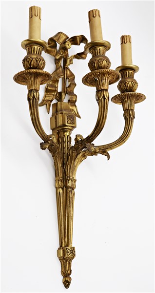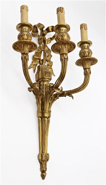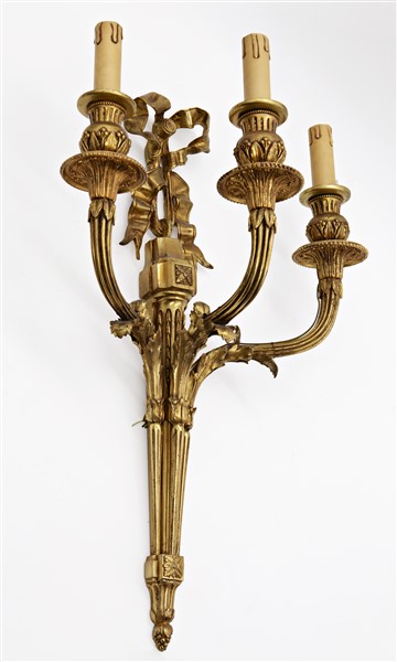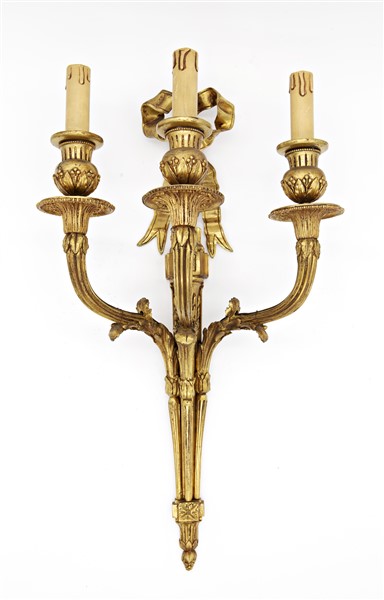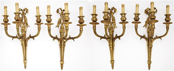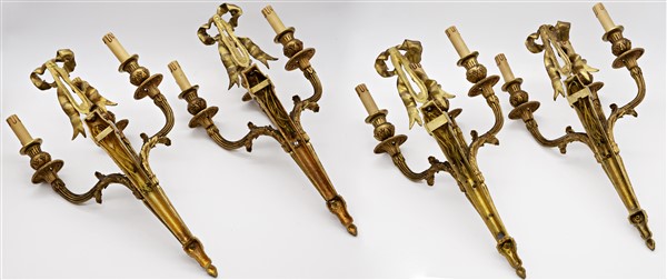 Gruppo di quattro appliques a tre luci in bronzo dorato con bracci e sostegni scanalati sormontate da nastro (h cm 55) (difetti)