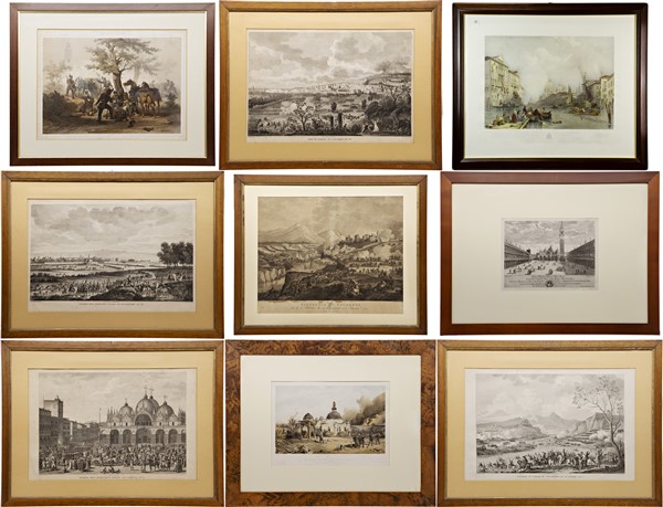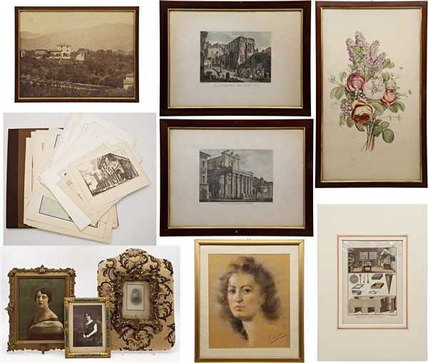 Cartone contenente incisioni e riproduzioni di soggetti differenti e foto d'epoca, alcune in cornice (difetti)