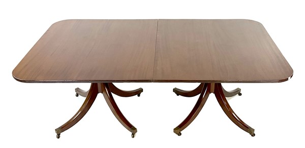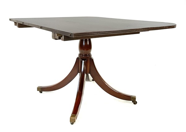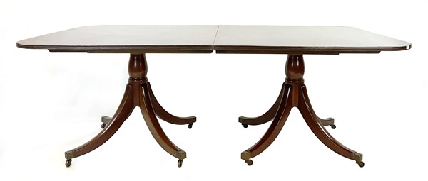 Tavolo allungabile in mogano con doppio sostegno e gambe arquate, piedi muniti di rotelle. Inghilterra, inizio secolo XX (cm 204x74x120) dotato di due allunghi (L cm 46 cad.) (difetti)