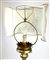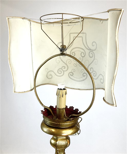 Torciera tripode in legno dorato, secolo XIX (h cm 121) adattata a lampada con paralume in epoca successiva (difetti)