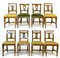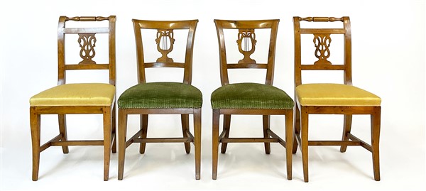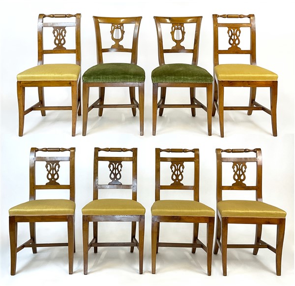 Lotto composto da sei sedie in ciliegio con schienale a giorno e gambe riunite da traversa unite a una coppia di sedie con schienale centrato da cartella a lira. (difetti)