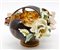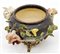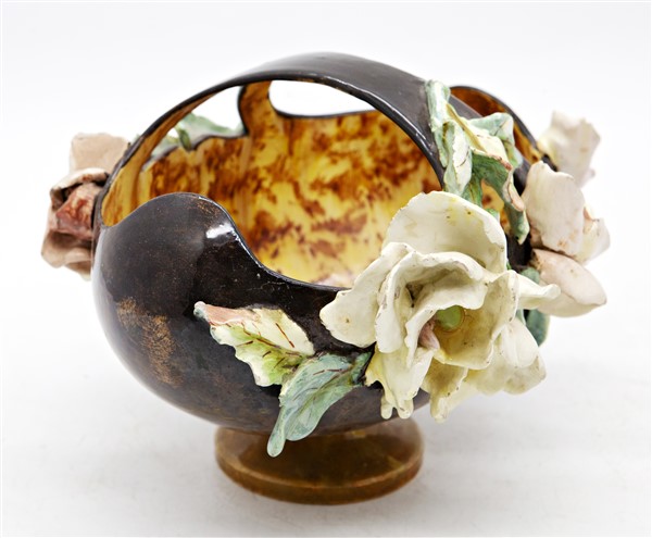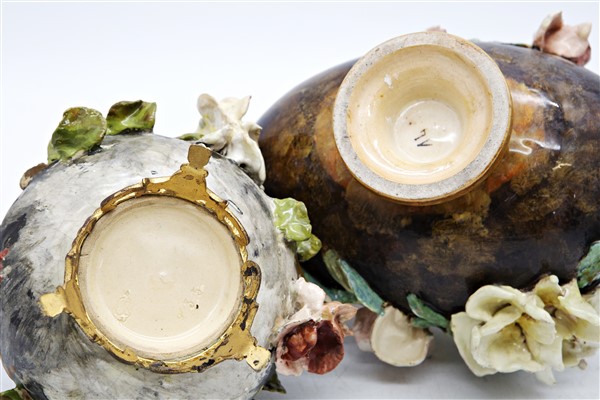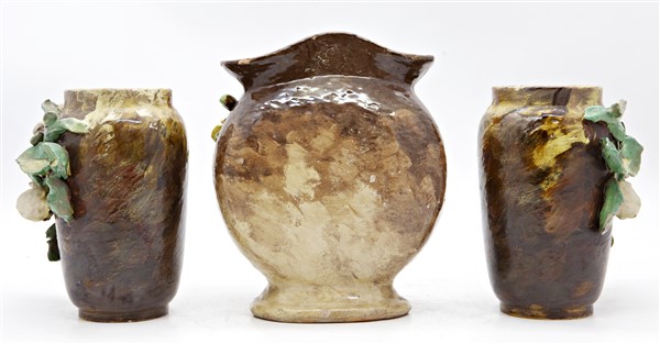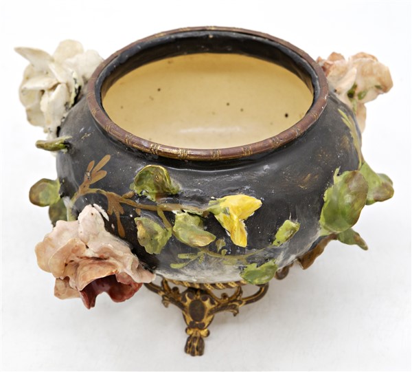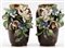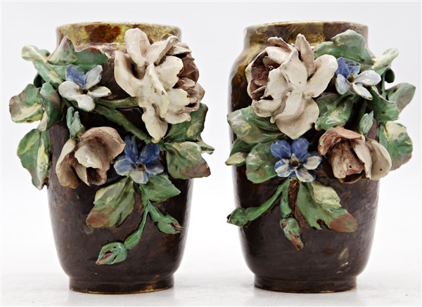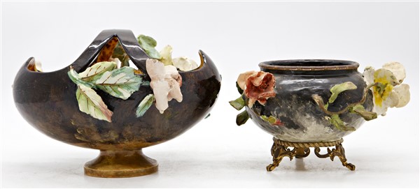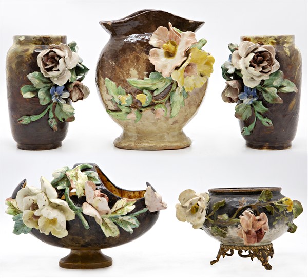 Manifatture differenti, inizio XX secolo. Lotto di quattro vasi ed un cestino in ceramica dipinta in policromia con applicazioni in altorilievo a motivi floreali (h max cm 23) (difetti e mancanze)