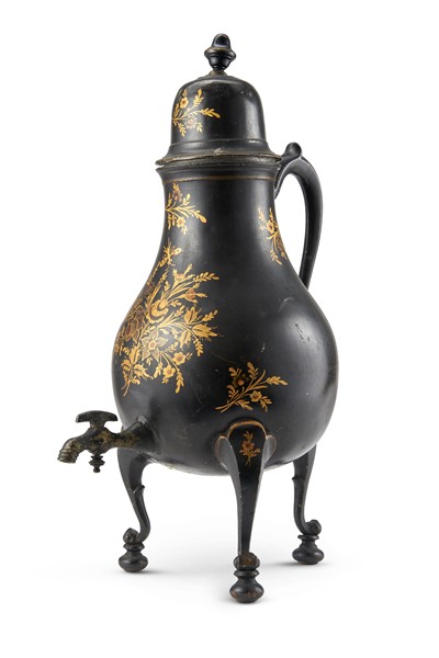 Manifattura inglese, secolo XVIII. Samovar piriforme in metallo dipinto e dorat