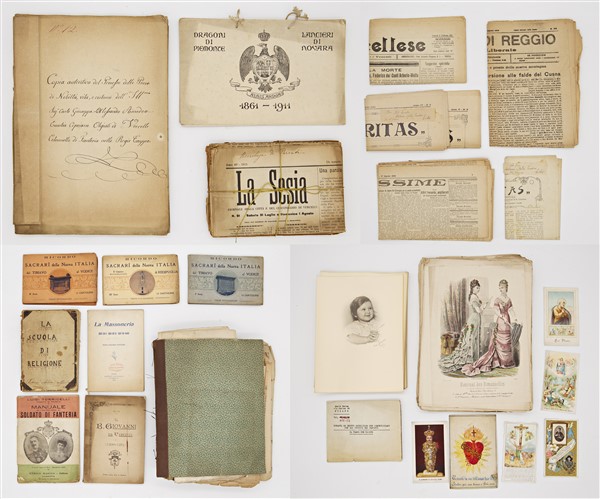 Cartone contenente numerose curiosità cartacee, si segnalano quotidiani della fine del secolo XIX ,incisioni de "Journal de demoiselles" e numerosi santini dell'inizio del secolo XX (difetti)