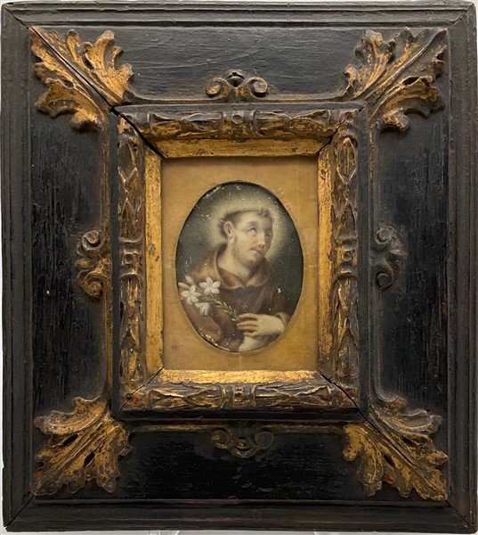Lotto 250 | Arte del secolo XIX. Sant'Antonio, miniatura ovale su pergamena (l cm 8) in cor