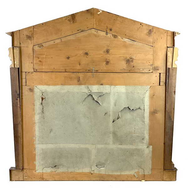 Caminiera in noce e legno intagliato e dorato con fregio entro timpano a forma di rapace su dardo e tralci d'uva, erme laterali. Secolo XIX (cm 134x132) (lievi difetti e piccole mancanze)