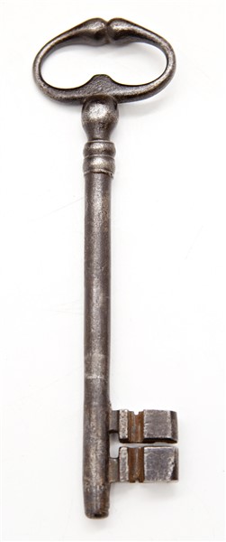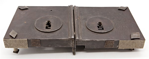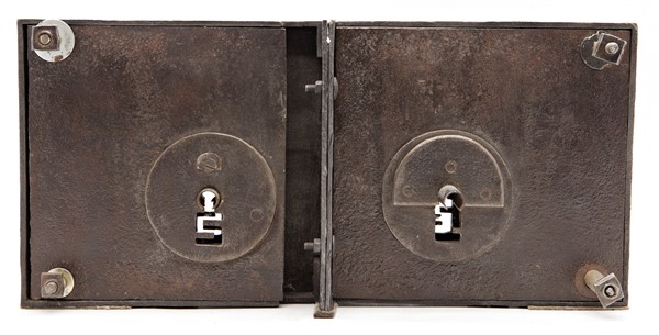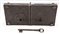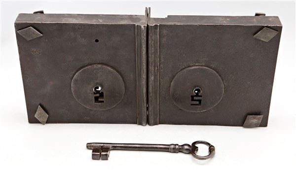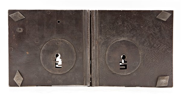Antica serratura in fusione di ferro ribattuto con doppia mostra di cui una sola con chiave e meccanismo di chiusura (cm tot 44x20,5x4) (difetti)