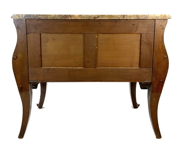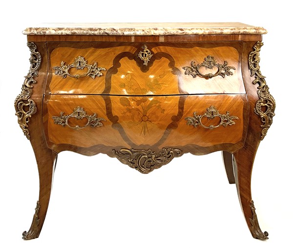Cassettone bombato e impiallacciato con decori ad intarsio in legni vari a motivo floreale entro riserve, fronte a due cassetti e guarnizioni in metallo dorato, piano in marmo. (cm 106x90x60) (difetti)