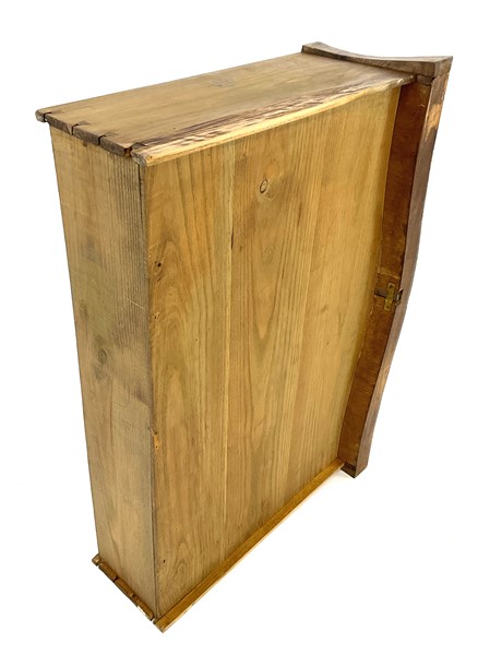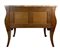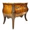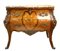 Cassettone bombato e impiallacciato con decori ad intarsio in legni vari a moti