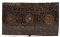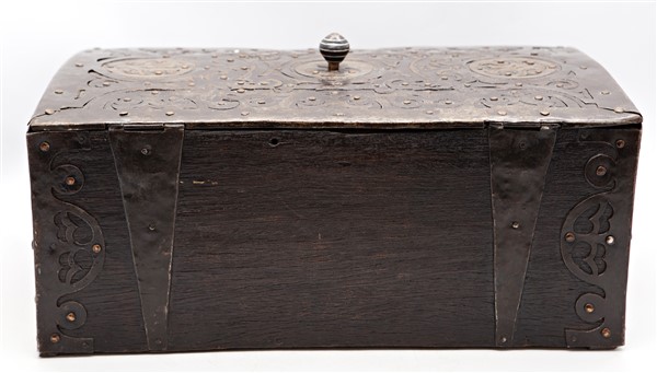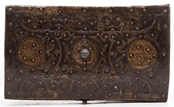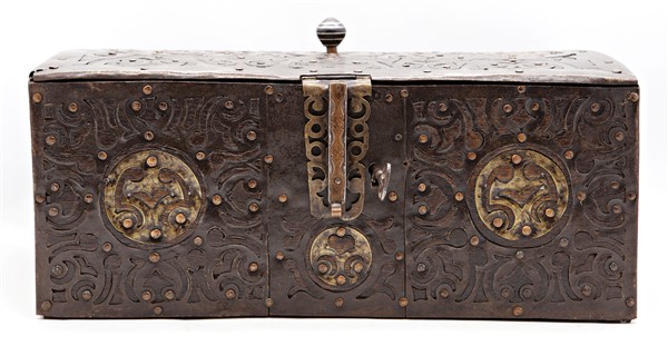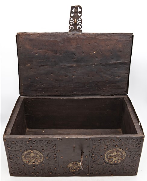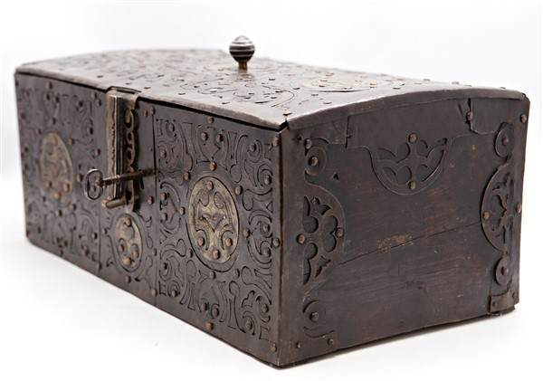Scrigno in legno decorato da placche in ferro battuto e sagomato a volute e for