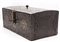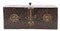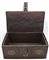 Scrigno in legno decorato da placche in ferro battuto e sagomato a volute e forme geometriche, fissate da borchie in rame, completo di serratura (cm 49x23x28,5) (difetti)