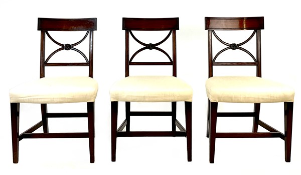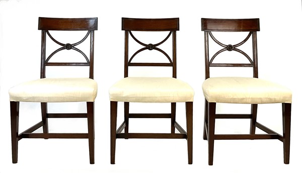 Gruppo di dieci sedie e coppia di poltrone in mogano con schienale a giorno e cartella a volute incociate. Inghilterra, inizio secolo XX (difetti)