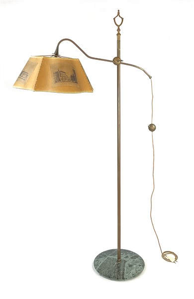 Lampada da terra in ottone con braccio regolabile e paralume sagomato in cartoncino, base circolare in marmo (h 163) (difetti)