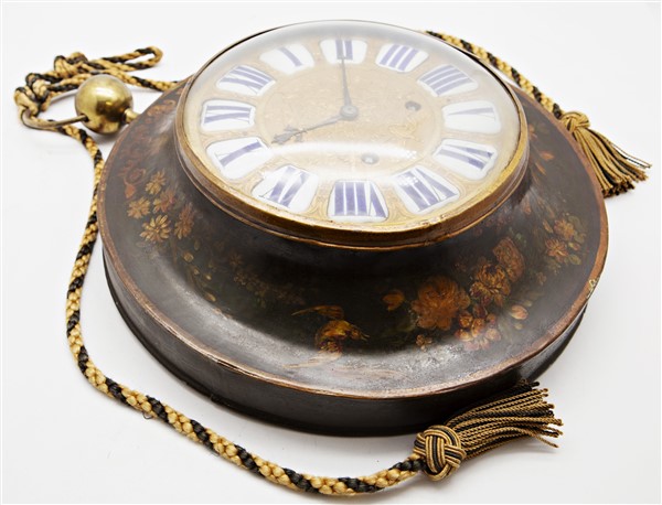 Orologio da muro formato da un movimento del secolo XVIII, inserito in una cassa lignea decorata a motivi floreali di epoca ottocentesca.