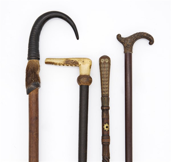 Lotto composto da sette bastoni da passeggio ed un frustino in legno intagliato, corno ed osso, alcuni decorati da applicazioni in metallo (L max cm 92) (difetti)