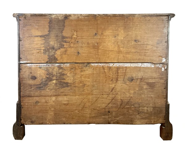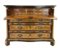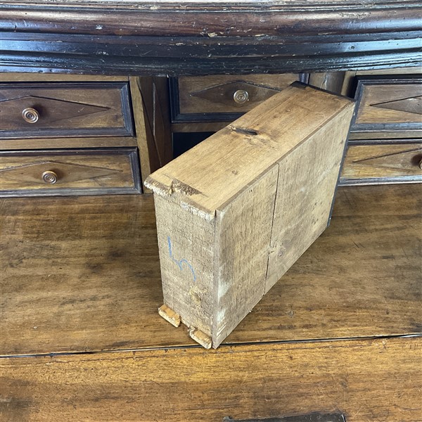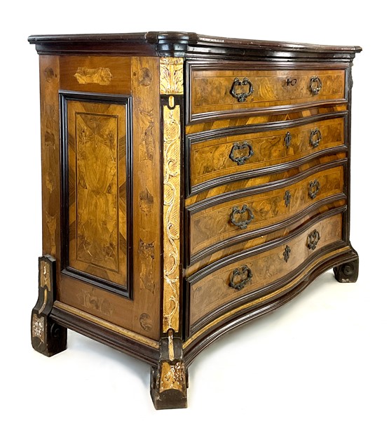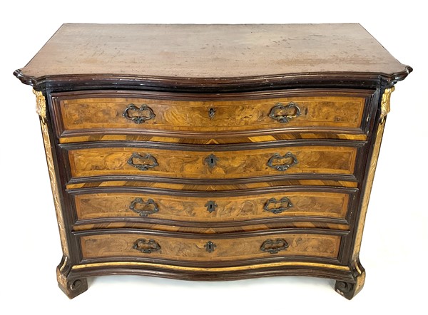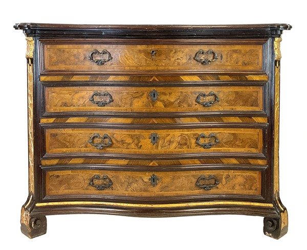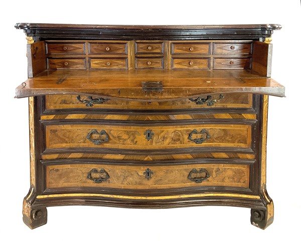 Canterano in noce lastronato e filettato in radica e in legno chiaro, fronte mosso a quattro cassetti dei quali uno sottopiano ribaltabile e celante dieci diversi tiretti, bordure e montanti decorati da intagli a volute e dorati, piedi a ricciolo. Lombardia, secolo XVIII. (cm 145x111x66) (difetti e restauri)