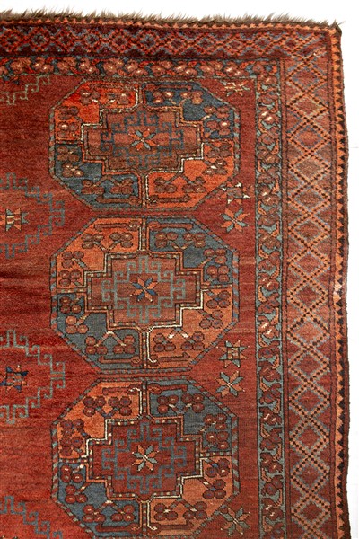 Tappeto Beshir, Turkestan occidentale, fine secolo XIX. Decoro con Gül di grandi dimensioni con il trifoglio di Tamerlano nei toni del verde, rosso scuro, rosa e blu su campo rosso mattone (cm 296x232) (difetti e vecchi restauri)