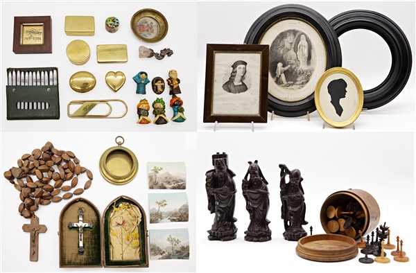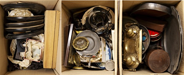 Lotto composto da tre cartoni contenenti oggetti vari di diverso uso in metallo e materiali differenti, tra cui delle cornici (difetti)