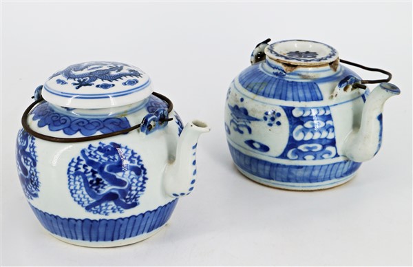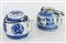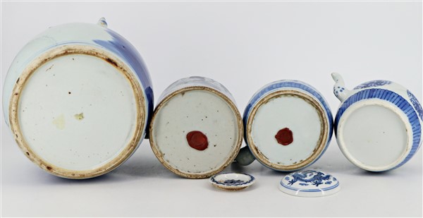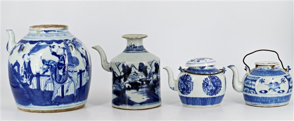 Lotto 326 | Tre teiere e un'anfora in porcellana bianca e blu con decori vari, di cui tre c