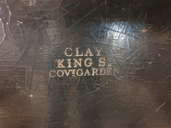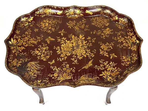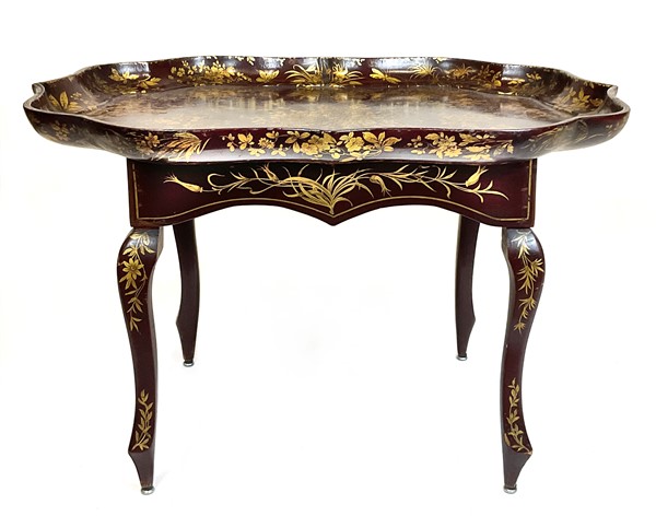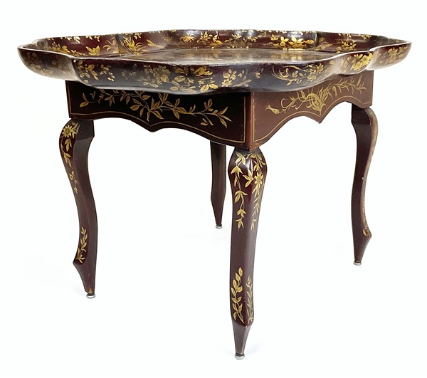 Tavolino da salotto in legno e papier-machè laccato con decorazione floreale in oro su fondo bordeaux, piano a vassoio sagomato e gambe mosse. Stampigliatura sul fondo "CLAY KING St COV t GARDEN" (cm 80x51x60) (difetti)