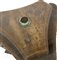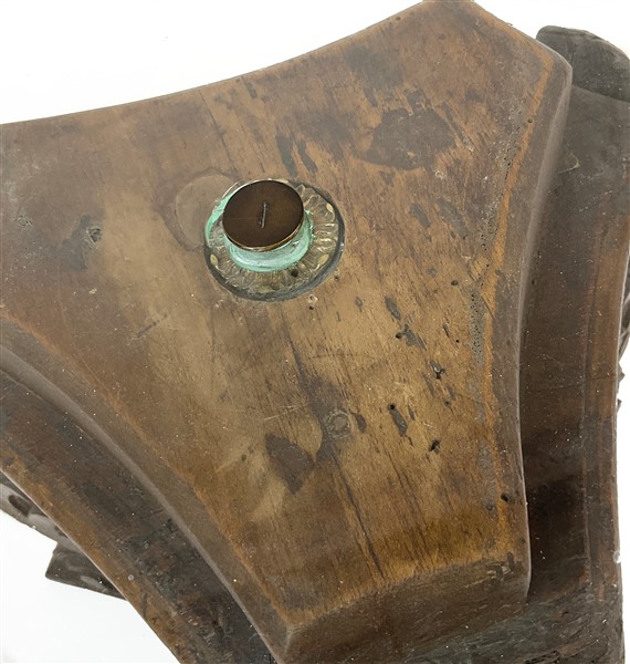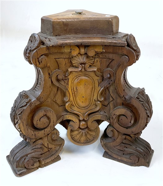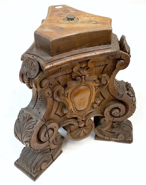 Lotto 345 | Base tripode in legno intagliato a volute e cartigli a scudo su valva di conchi