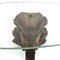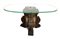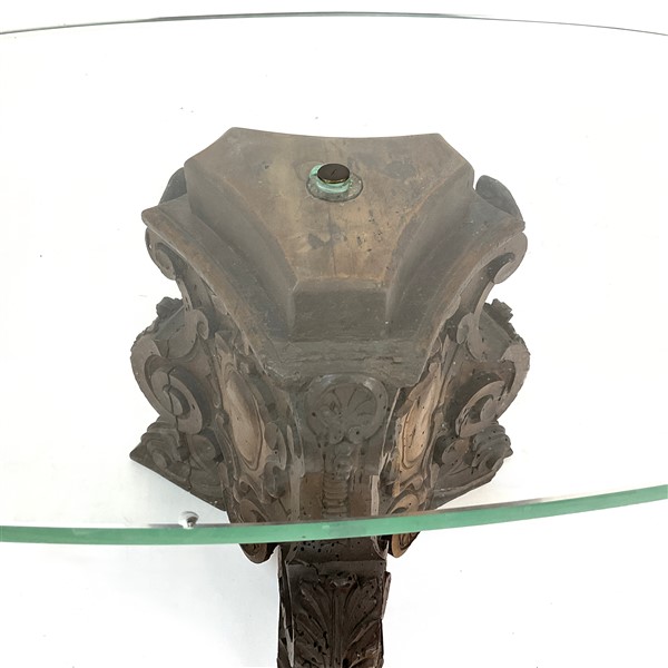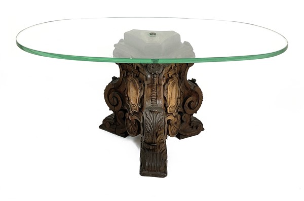 Base tripode in legno intagliato a volute e cartigli a scudo su valva di conchiglia. Secolo XVIII. Adattata a sostegno per tavolino da salotto con piano ovale in vetro (cm 80x38x44) (difetti e scheggiature a vetro)