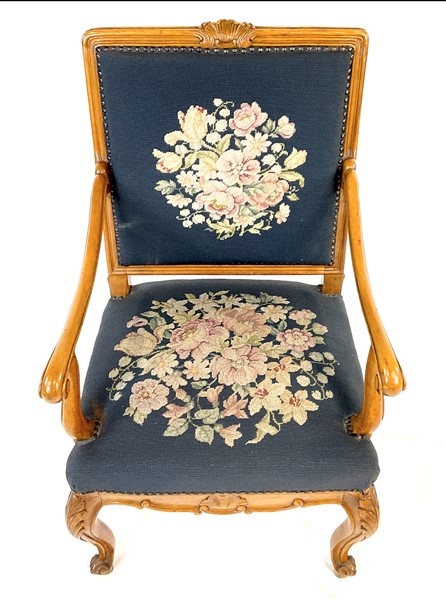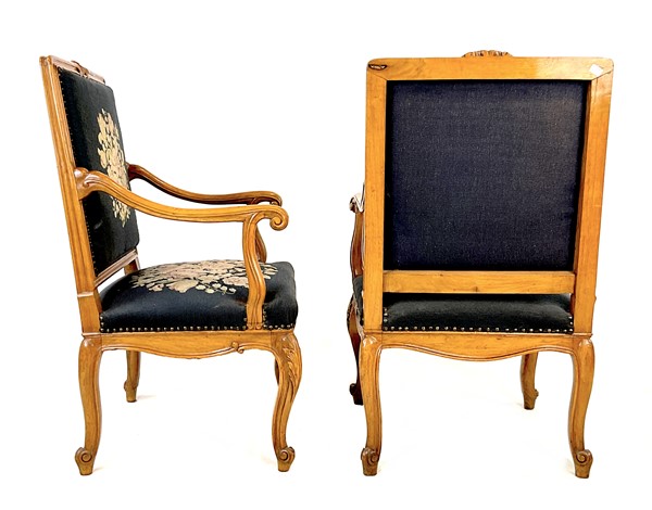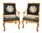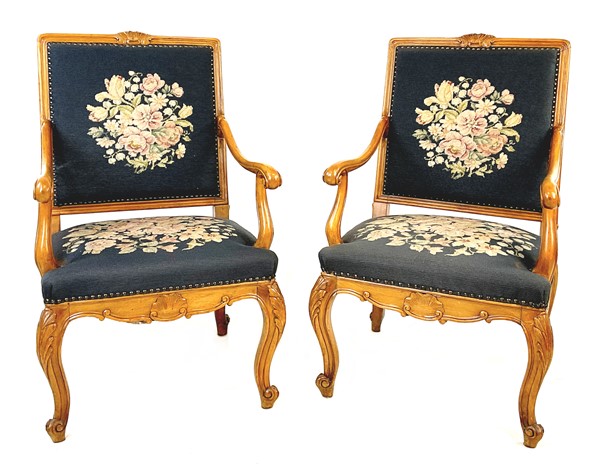 Coppia di poltrone in legno intagliato con gambe mosse, rivestimento a piccolo punto con motivo floreale (difetti)