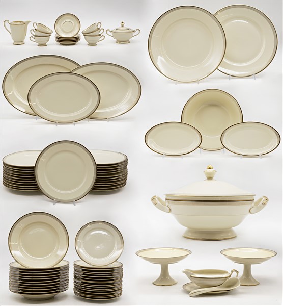 Manifattura Eschenbach, Bavaria. Servizio di piatti in porcellana color avorio con profili blu e oro, composto da dodici piatti fondi e ventiquattro piani, diciassette piattini da frutta, tre piatti da portata ovali e due raviere, due piatti da portata tondi, insalatiera e salsiera con cucchiaio, due alzatine, sei tazzine con piattini, lattiera e zuccheriera. Germania, prima metà secolo XX. Marcata "Eschenbach Bavaria ELFENBEIN PORZELLAN". (lievi difetti)