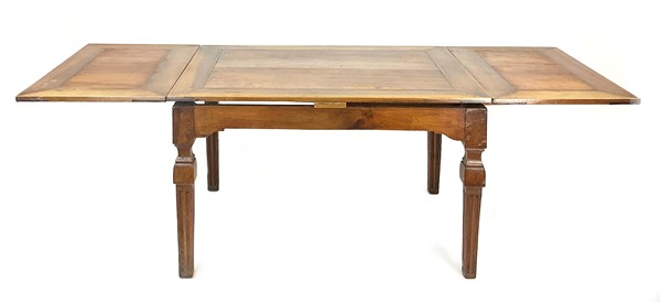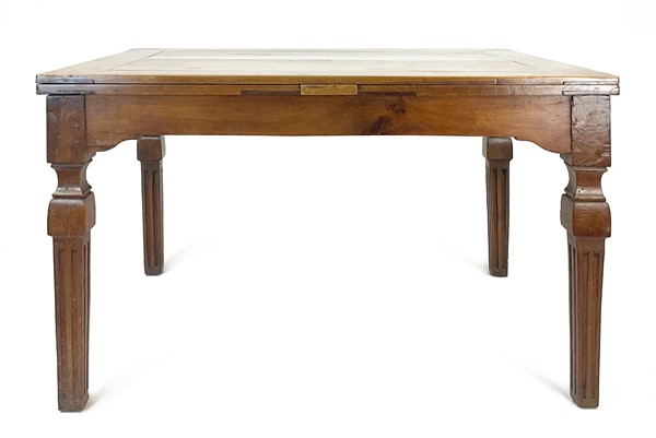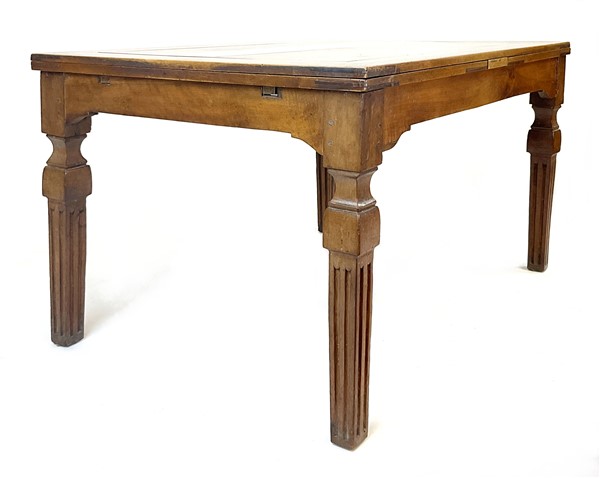 Tavolo allungabile in noce con gambe scanalate e doppio allungo a tiro. Secolo